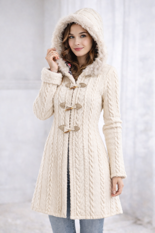 Dressfo Women’s Christmas Plaid Hooded Coat – Cable Knit Long Coat with Faux Fur & Horn Buttons
